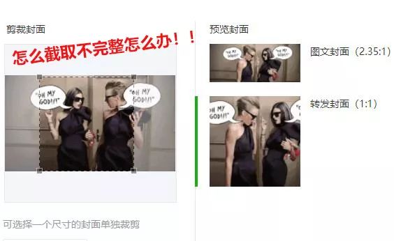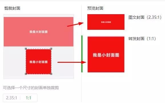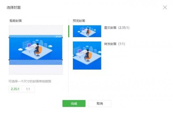 我們?cè)谖⑿藕笈_(tái)還是按照900x500px的尺寸做圖上傳,現(xiàn)在微信后臺(tái)會(huì)提供 2.35:1 和 1:1這2個(gè)尺寸進(jìn)行裁剪。