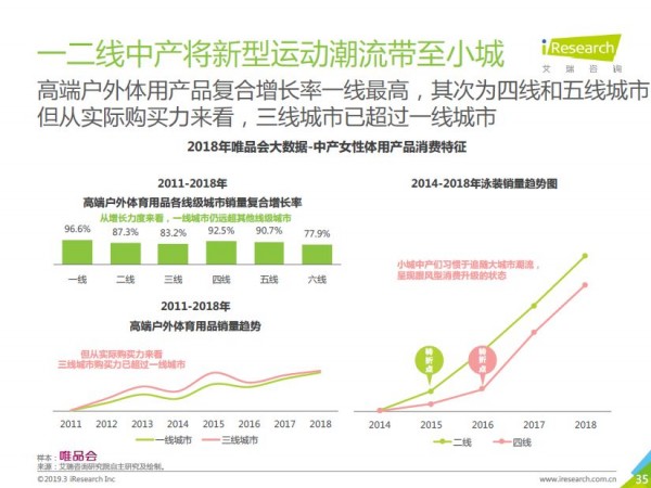 通過上圖我們發(fā)現(xiàn),2011年起戶外體育產(chǎn)品才開始快速增長(zhǎng),而泳裝這個(gè)品類,在二線城市的轉(zhuǎn)折點(diǎn)是2015年,四線是2016年才出現(xiàn)。一二線的風(fēng)潮對(duì)小城的引領(lǐng)性依然明顯。