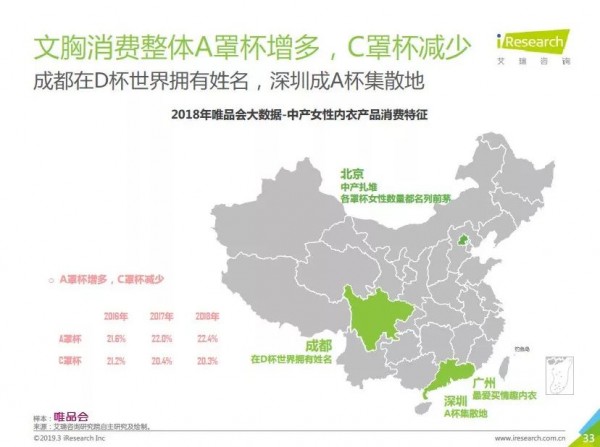 通過唯品會(huì)大數(shù)據(jù),我看到了一個(gè)很神奇的數(shù)據(jù)和地圖——文胸消費(fèi)中整體A罩杯增多,C罩杯在減少。直男的我不禁在思考,難道是胸都變小了嗎?