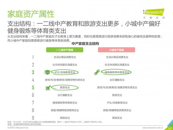 隨著經(jīng)濟(jì)的發(fā)展,無形消費(fèi)及服務(wù)性消費(fèi)的比重會(huì)越來越大。一二線中產(chǎn)家庭對(duì)比小城市中產(chǎn)家庭有兩項(xiàng)支出比例特別高:1.子女及自身教育支出;2.旅游支出。而在小城市,在健身鍛煉上的支出正在快速上升。