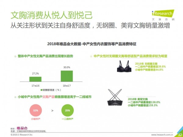 與罩杯變化呼應(yīng)的是:文胸的消費(fèi)已經(jīng)從關(guān)注形狀向自身舒適度、無鋼圈、美背的方向發(fā)展,這些品種的銷量在快速增長(zhǎng)。2018年無鋼圈文胸在唯品會(huì)上的增速在一二線中產(chǎn)是39.8%,在小城市中產(chǎn)是44.8%。美背文胸更快,在一二線中產(chǎn)增速是138%,在小城市中產(chǎn)則是159.3%。