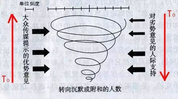 當(dāng)一個(gè)有爭議的話題出現(xiàn)時(shí),觀點(diǎn)雙方的聲音一大一小。這時(shí)候,聲音較大的一方如果看到自己贊同的觀點(diǎn)收到歡迎,就會(huì)更加積極地發(fā)表和擴(kuò)散觀點(diǎn);而聲音較小的一方處于劣勢,因?yàn)楹ε卤弧肮铝ⅰ保詢A向于保持沉默。最后,一方觀點(diǎn)越來越強(qiáng)大,完全壓倒較弱的一方。