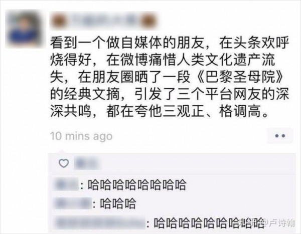 比如,今日頭條的主要是刷“燒得好”,微博主要是刷“痛惜人類文化遺產(chǎn)流失”,而朋友圈刷的是《巴黎圣母院》或雨果或游客心得……