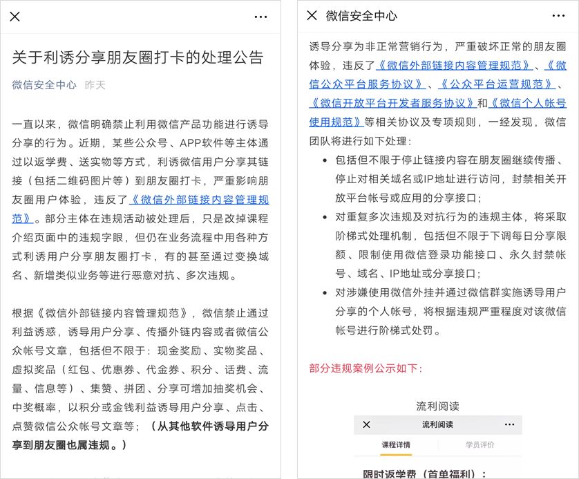 因為微信爸爸發(fā)布了《關(guān)于利誘分享朋友圈打卡的處理公告》,強(qiáng)調(diào)要嚴(yán)懲誘導(dǎo)分享行為。這些誘導(dǎo)分享行為包括但不限于通過以返學(xué)費、送實物等方式,利誘微信用戶分享其鏈接(包括二維碼圖片等)到朋友圈打卡。