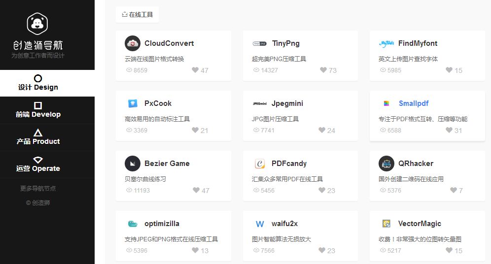 創(chuàng)造獅,是一個專門針對創(chuàng)意工作者的導(dǎo)航網(wǎng)站,專注分享設(shè)計、前端、產(chǎn)品、運(yùn)營四個方面優(yōu)質(zhì)資源,不僅有很多國內(nèi)優(yōu)質(zhì)站點,還有國外網(wǎng)站推薦。