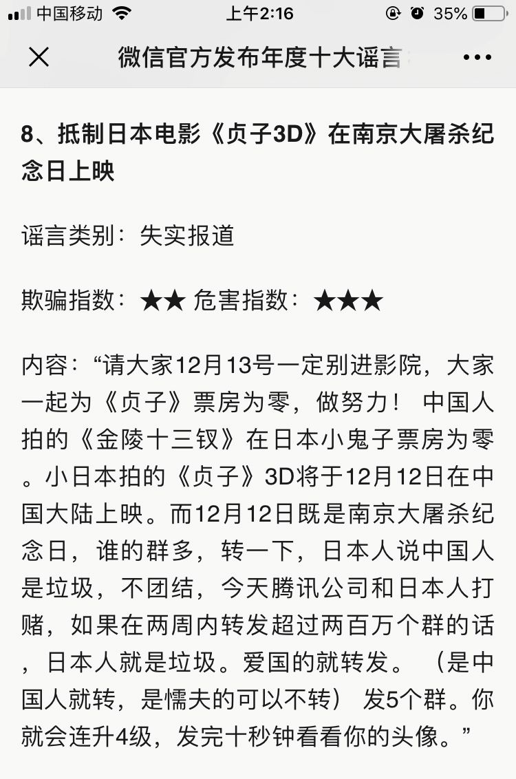 像“釣魚島開戰(zhàn)”、“抵制貞子電影”這類謠言都屬于煽動(dòng)情緒類型,通常會(huì)讓用戶的心理產(chǎn)生劇烈波動(dòng)。然后在“震驚”、“感動(dòng)”或“氣憤”等情緒的驅(qū)動(dòng)下,進(jìn)行傳播分享。