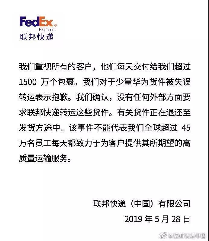 聯(lián)邦快遞中國(guó)官方微博發(fā)布聲明稱,“我們對(duì)于少量華為貨件被失誤轉(zhuǎn)運(yùn)表示抱歉。我們確認(rèn),沒(méi)有任何外部方面要求聯(lián)邦快遞轉(zhuǎn)運(yùn)這些貨件。有關(guān)貨件正在退還至發(fā)貨方途中。