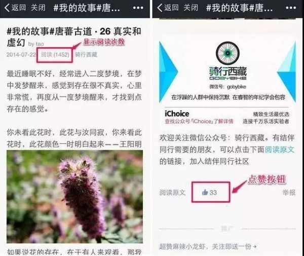 2014 年 7 月 23 日的深夜,公眾號(hào)“騎行西藏”(這個(gè)是前微信開放平臺(tái)技術(shù)總監(jiān)tao的個(gè)人公號(hào))推送的文章突然顯示了閱讀量和點(diǎn)贊按鈕。自此之后,公眾號(hào)運(yùn)營者的 KPI 變成了閱讀量和點(diǎn)贊量。