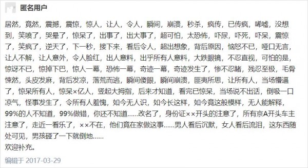 不轉(zhuǎn)不是中國人、中國人必看、不看后悔五百年、罕見、世間絕無僅有、難得一見、太震撼了、轟動(dòng)全國、驚動(dòng)中央、嚇到人類、膽小的莫看、你還不知道嗎、你肯定不知道……