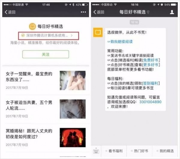 類似的還有在標(biāo)題前加上「你已被移出群聊」「你已被對(duì)方刪除好友」的字樣,看見這樣的標(biāo)題,用戶一般會(huì)下意識(shí)的點(diǎn)進(jìn)去看看,心想到底被誰移出了群聊,點(diǎn)進(jìn)去一看原來是各種奇葩網(wǎng)文小說。