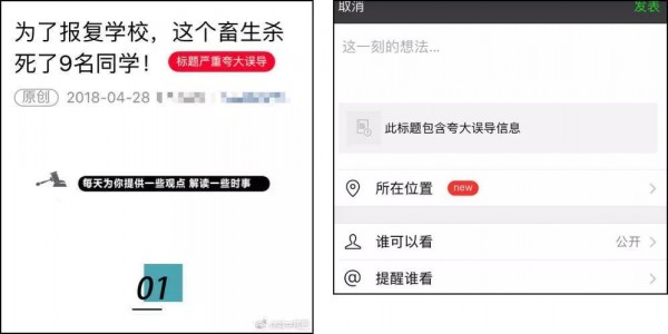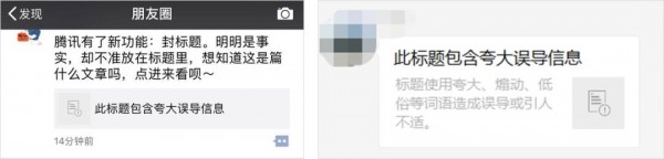2018 年 5 月,微信又上線了一種新的處罰措施:可以只封標(biāo)題,不封內(nèi)容。截圖顯示,一篇被微信標(biāo)注為“標(biāo)題嚴(yán)重夸大誤導(dǎo)”的推送文章,無論分享到朋友圈還是群聊中,標(biāo)題都會(huì)被隱藏。