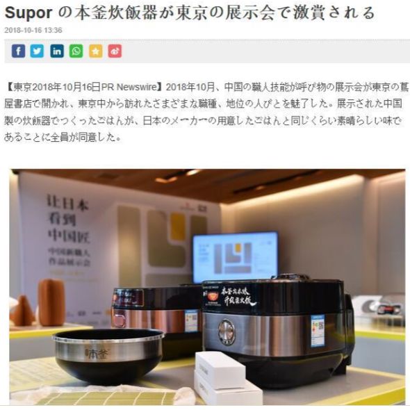 7個(gè)月前,蘇泊爾本釜電飯煲走出國(guó)門(mén),參加位于日本蔦屋書(shū)店的《讓日本看到中國(guó)匠》展覽。在日本國(guó)際通訊社的報(bào)道中講到:“來(lái)自各行各業(yè)的日本食客,他們一致反映中國(guó)飯煲做出的米飯口感真的一點(diǎn)不比日本飯煲的差?!贝藞?bào)道一出在日本引起軒然大波,引發(fā)日本民眾廣泛討論。