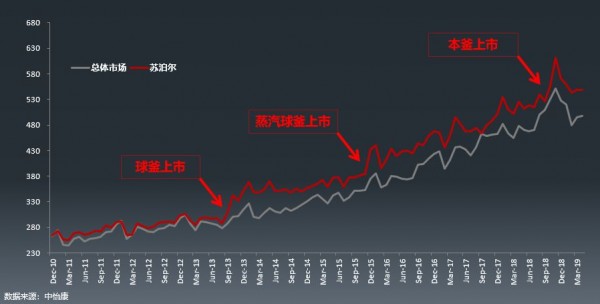 而這一切給蘇泊爾帶來(lái)的,則是強(qiáng)大的市場(chǎng)號(hào)召力。球釜和本釜電飯鍋的上市,直接拉動(dòng)了整個(gè)行業(yè)電飯煲的質(zhì)量和價(jià)格水平,對(duì)比曲線圖就可以清晰地看到,每一輪蘇泊爾新產(chǎn)品的上市都直接帶動(dòng)了全行業(yè)的曲線波動(dòng),同時(shí)也讓其本身的市場(chǎng)認(rèn)知率大幅度上升。