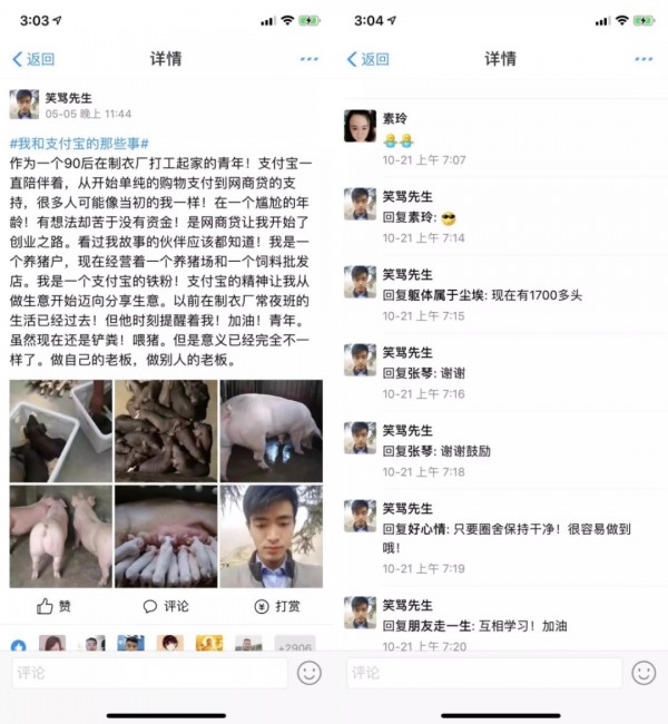 一個(gè)90后男生,從制衣廠打工開(kāi)始做,現(xiàn)在擁有自己的養(yǎng)豬場(chǎng)和飼料批發(fā)店。帖子里他曬出了很多豬的圖片。在評(píng)論中,他告訴網(wǎng)友,現(xiàn)在已經(jīng)有1700頭豬的規(guī)模了。在質(zhì)樸的語(yǔ)言里,他更多的是對(duì)生活的期冀,他說(shuō):雖然現(xiàn)在還是鏟糞,喂豬。但是意義已經(jīng)完全不一樣了。
