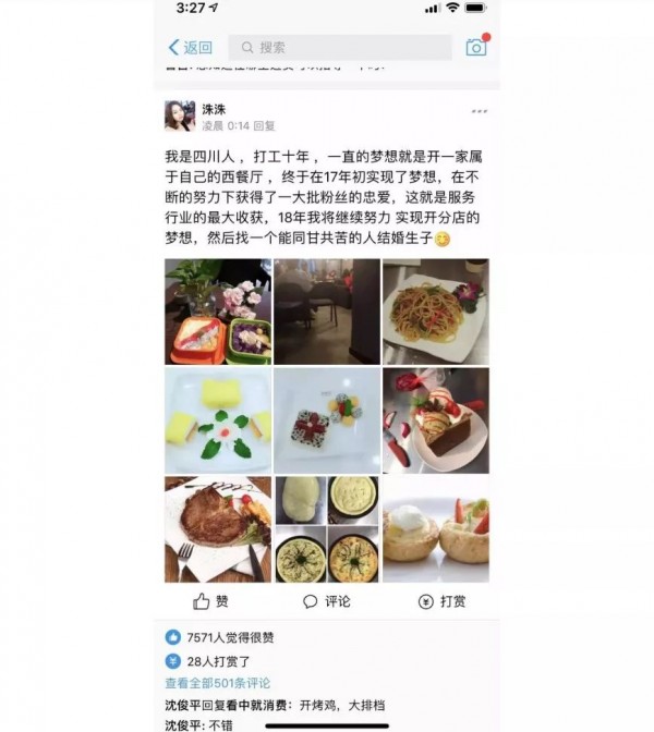 另一位女生,打工十年,終于在2017年開(kāi)了一家屬于自己的西餐廳。她今年的目標(biāo)是開(kāi)一家分店,然后找一個(gè)能同甘共苦的人結(jié)婚生子。浮夸的時(shí)代,看到這樣踏實(shí)的愿望,讓人感受到了溫暖。
