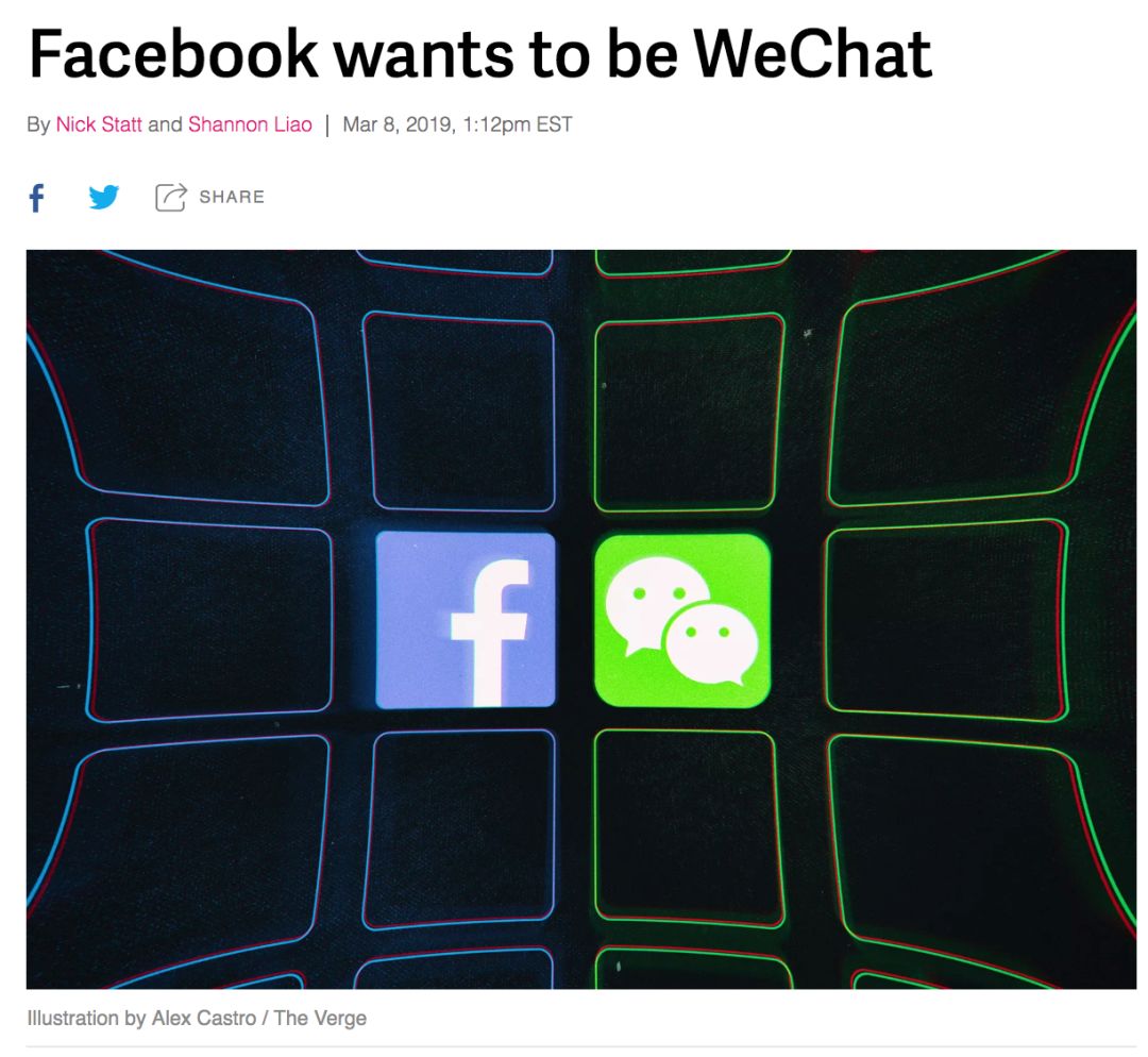最近,扎克伯格發(fā)布公開信表達愿景,要在臉書中加入移動支付、電商功能,網(wǎng)友們立刻評論說臉書撞臉“微信”。甚至有外媒直接發(fā)文章:“臉書想要成為微信” 。