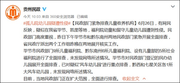 6月27日,在天津公安機(jī)關(guān)的支持下,貴州公安機(jī)關(guān)依法對在網(wǎng)上傳播“畢節(jié)、凱里有未成年兒童被性侵”照片及信息的發(fā)帖人趙某某進(jìn)行了訊問。