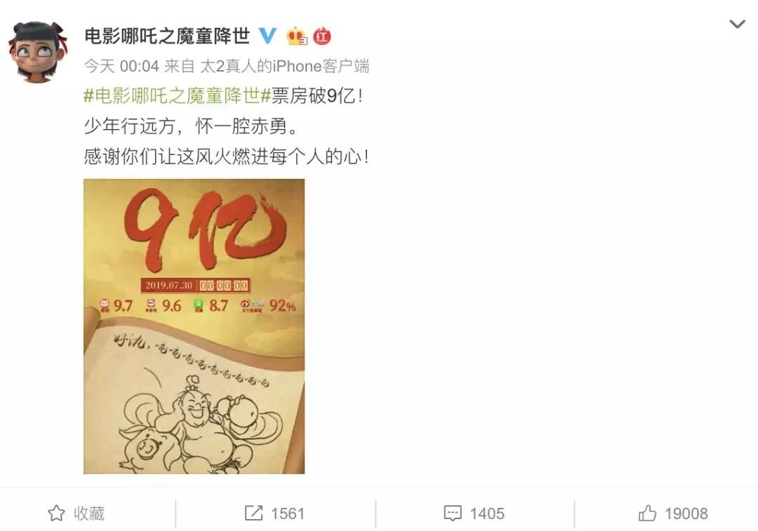 據(jù)電影《哪吒之魔童降世》官方微博消息,國產(chǎn)動畫片《哪吒之魔童降世》7月26日上映至今目前票房已破9億,將有望刷新中國市場動畫電影新紀(jì)錄。