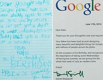 “親愛(ài)的谷歌工人,你可以在我爸爸上班的時(shí)候,給他放一天假嗎?比如讓他在周三休息一天。因?yàn)槲野职置恐苤荒茉谥芰菹⒁惶臁P蒂。附筆:那天是爸爸的生日。再附筆:這是夏天(暑假)?!薄坝H愛(ài)的凱蒂,感謝你的來(lái)信和你提出的要求。你的父親在工作上一直很努力,他為谷歌和全世界千千萬(wàn)萬(wàn)人設(shè)計(jì)出了很多漂亮的、令人欣喜的東西。鑒于他的生日已快到來(lái),以及我們也意識(shí)到了在夏天挑個(gè)周三休息一下的重要性,我們決定讓他在7月的第一周休假一個(gè)星期。祝好!丹尼爾?席普藍(lán)克夫?!?/span>