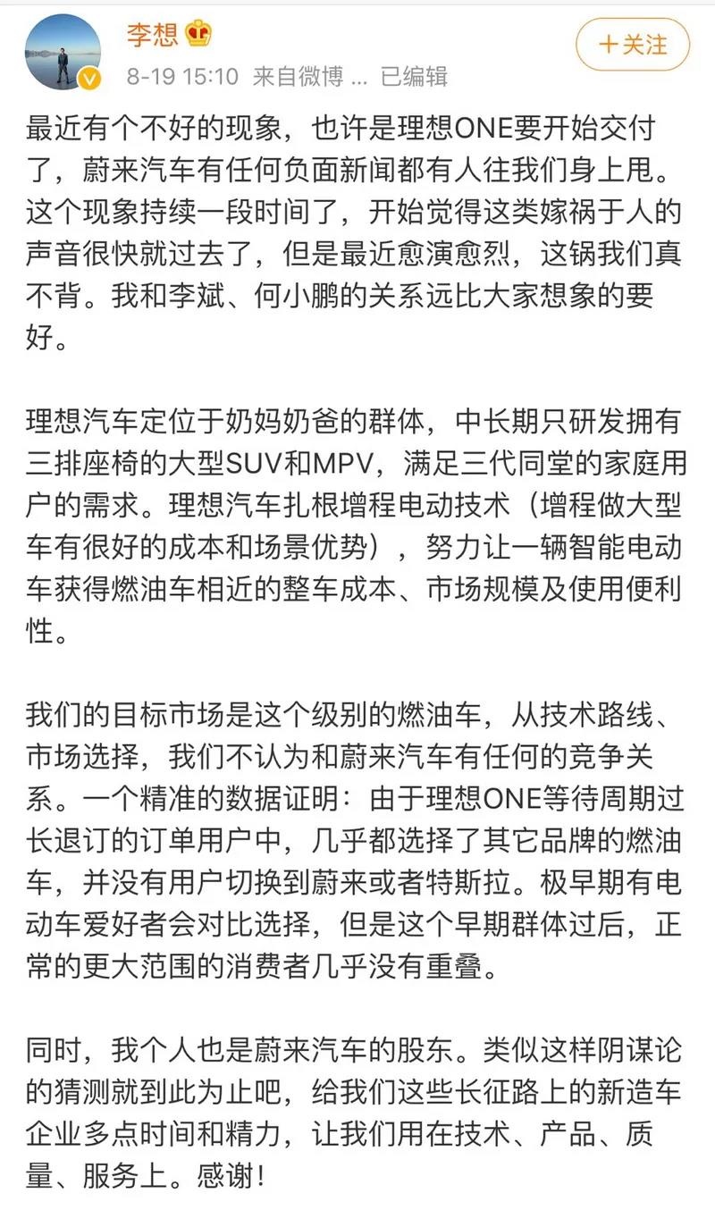 汽車之家創(chuàng)始人、車和家CEO李想在微博發(fā)文稱:“最近有個(gè)不好的現(xiàn)象,也許是理想ONE要開(kāi)始交付了,蔚來(lái)汽車有任何負(fù)面新聞都有人往我們身上甩?!崩钕氡硎?,“這個(gè)現(xiàn)象持續(xù)一段時(shí)間了,開(kāi)始覺(jué)得這類嫁禍于人的聲音很快就過(guò)去了,但是最近愈演愈烈,這鍋我們真不背。我和李斌、何小鵬的關(guān)系遠(yuǎn)比大家想象的要好?!?/span>