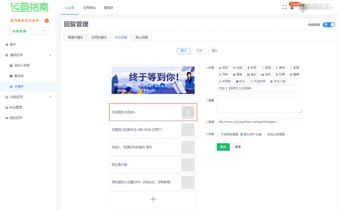 你想多啦,其實(shí)如果是運(yùn)營(yíng)指南的老朋友們,相信應(yīng)該都還記得這個(gè)功能吧↓ 以前叫『定制關(guān)注回復(fù)』,現(xiàn)在在『關(guān)鍵字』里面哦。