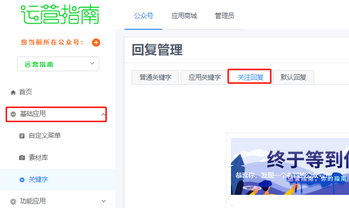 ② 登陸成功之后看左側(cè)菜單欄,基礎(chǔ)應(yīng)用>>關(guān)鍵字>>關(guān)注回復(fù)。