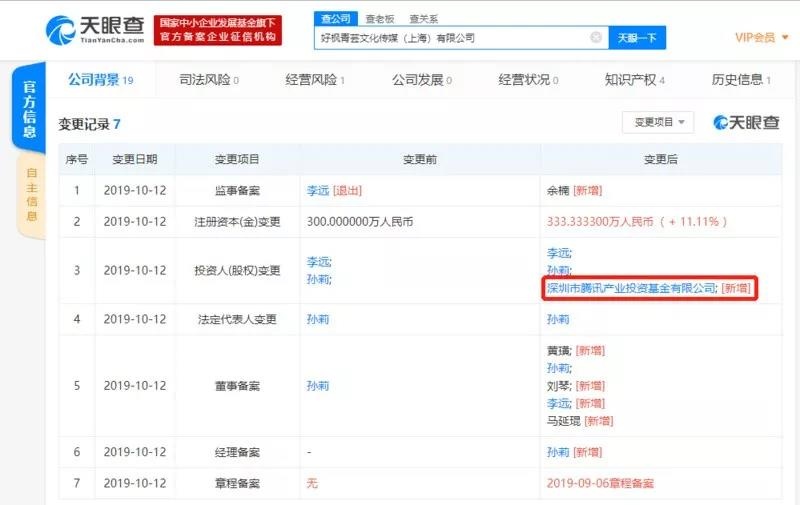 天眼查數(shù)據(jù)顯示,10月12日,好楓青蕓文化傳媒(上海)有限公司發(fā)生多項變更,投資人新增深圳市騰訊產(chǎn)業(yè)投資基金有限公司,注冊資本由300萬人民幣增至約333萬人民幣。深圳市騰訊產(chǎn)業(yè)投資基金目前以10%的持股比例成為第二大股東。好楓青蕓文化傳媒(上海)有限公司成立于2018年11月,法定代表人為《創(chuàng)造101》及《創(chuàng)造營2019》的總導(dǎo)演孫莉。