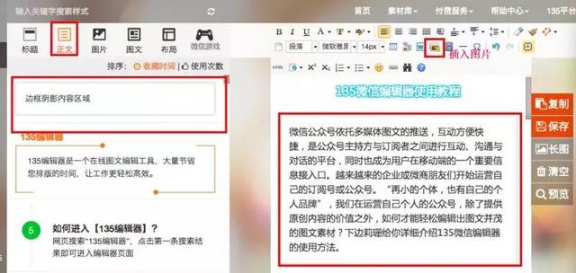 正文:選擇左邊正文的樣式,插入到右邊的編輯框內(nèi),輸入正文的內(nèi)容或圖片(格式同樣可以去素材庫(kù)是收藏新的樣式供自己使用。)