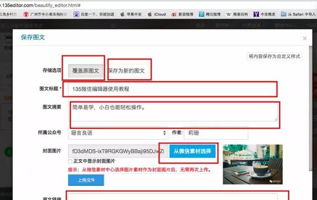 2、封面圖片需選擇從“微信素材選擇(圖片預(yù)先上傳到公眾號(hào))”,否則無(wú)法同步到微信公眾號(hào)。