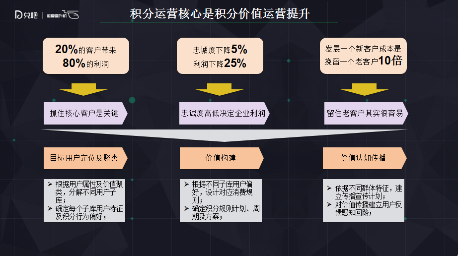 有了第一步之后,第二步就是如何和用戶運(yùn)營(yíng)關(guān)聯(lián)起來(lái),就是積分體系。因?yàn)榉e分體系是用戶運(yùn)營(yíng)的一個(gè)非常有效的手段,也是貫穿用戶運(yùn)營(yíng)三個(gè)核心工作的有效工具;第三步就是案例實(shí)戰(zhàn),積分體系運(yùn)營(yíng)的具體策略,和怎么做好積分體系;最后一個(gè)就是從各位的實(shí)際工作出發(fā),怎么做好運(yùn)營(yíng),從哪幾個(gè)角度去做,給出的運(yùn)營(yíng)建議。