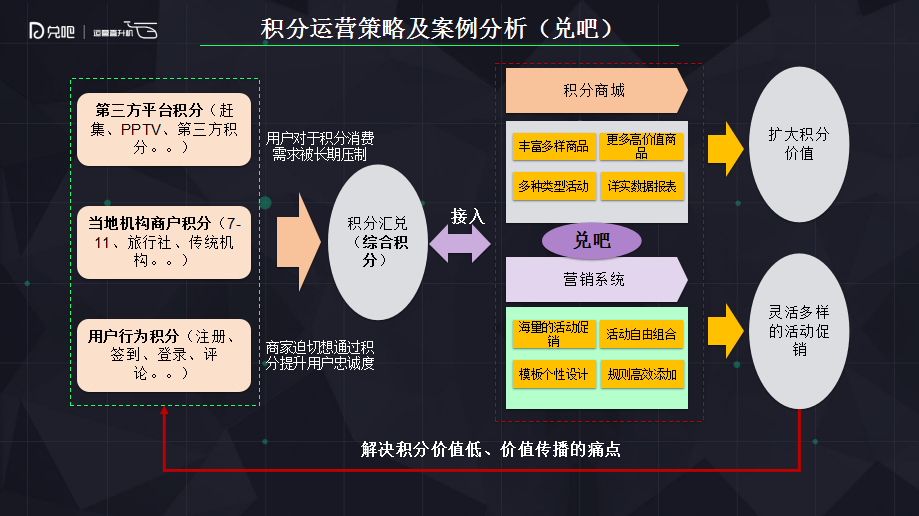 4.積分運(yùn)營(yíng)的核心在于解決積分價(jià)值低的痛點(diǎn),通過(guò)對(duì)接更多的積分消費(fèi)商家和可兌換的高價(jià)值商品,實(shí)現(xiàn)積分價(jià)值的提升。