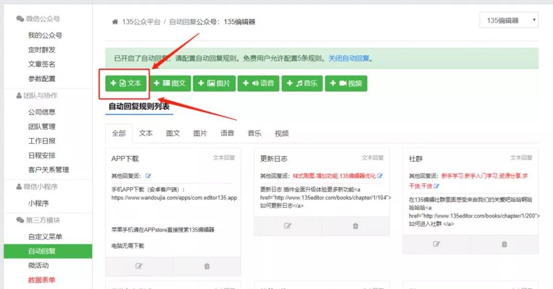 進(jìn)入自動(dòng)回復(fù)后,直接選擇文本項(xiàng)。這里僅示范如何設(shè)定有趣的關(guān)注回復(fù),其他自動(dòng)回復(fù),關(guān)鍵詞回復(fù)等功能不做介紹,只要你看懂接下來的步驟,其他設(shè)置方法你自然能融會(huì)貫通。
