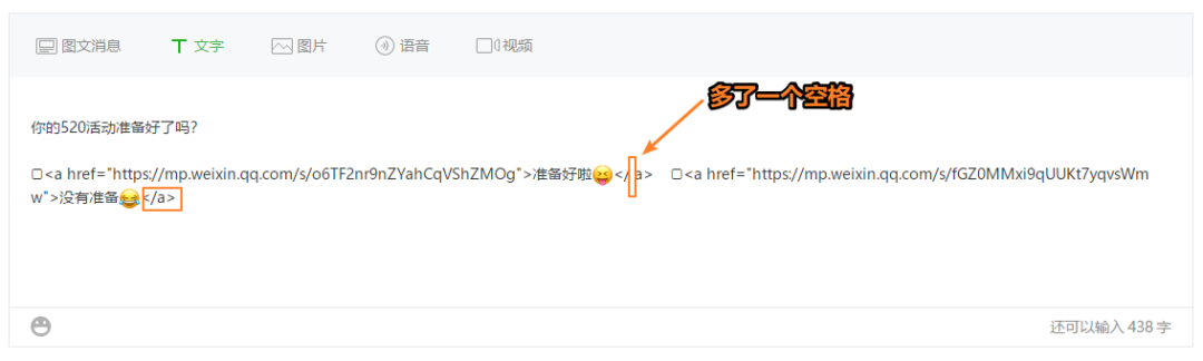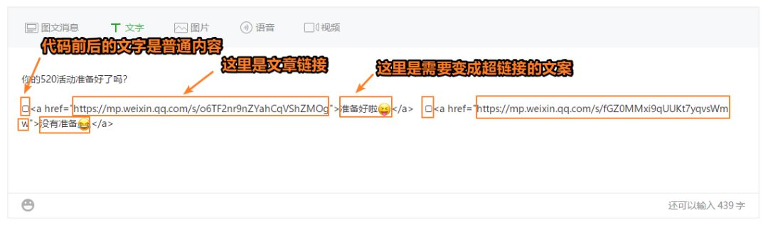復(fù)制以上代碼,或者手動輸入以上代碼到微信公眾號(輸入法一定要切換到英文),將要推送的文章鏈接放入代碼中的""內(nèi),超鏈接文案放在代碼中的><中間。