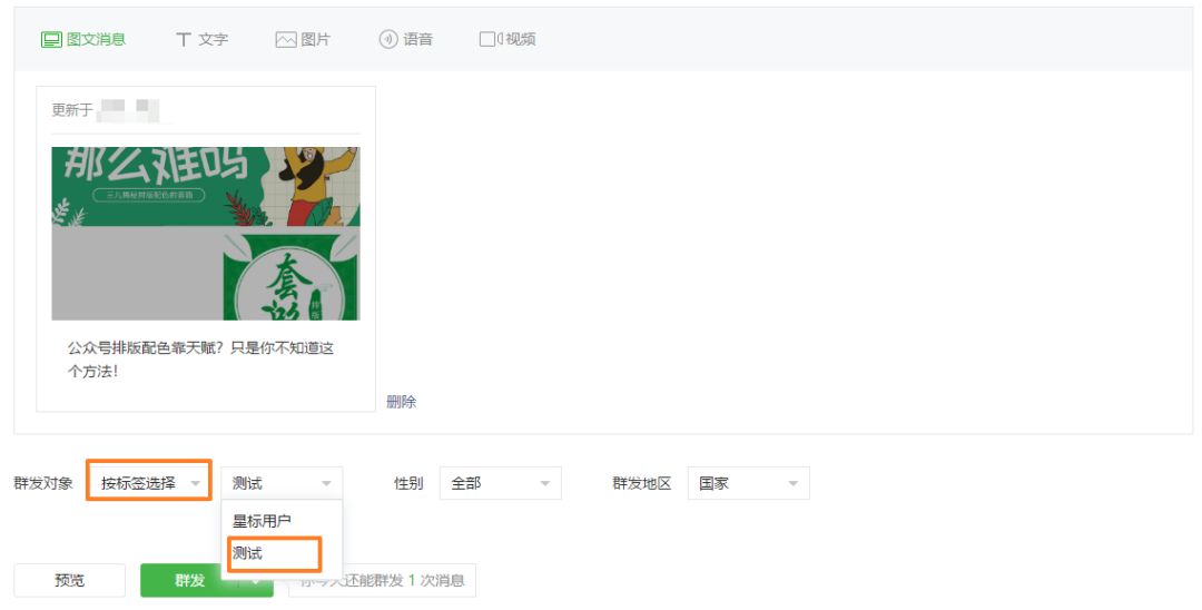 如果你運營的是非日更型公眾號,可以通過分組群發(fā)來實現(xiàn)。設(shè)置一個測試分組,只將一個公眾號小編的微信放入其中。選擇不推文的一天,將推文只發(fā)送給選中的管理員一個人。