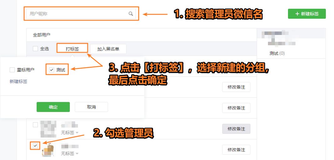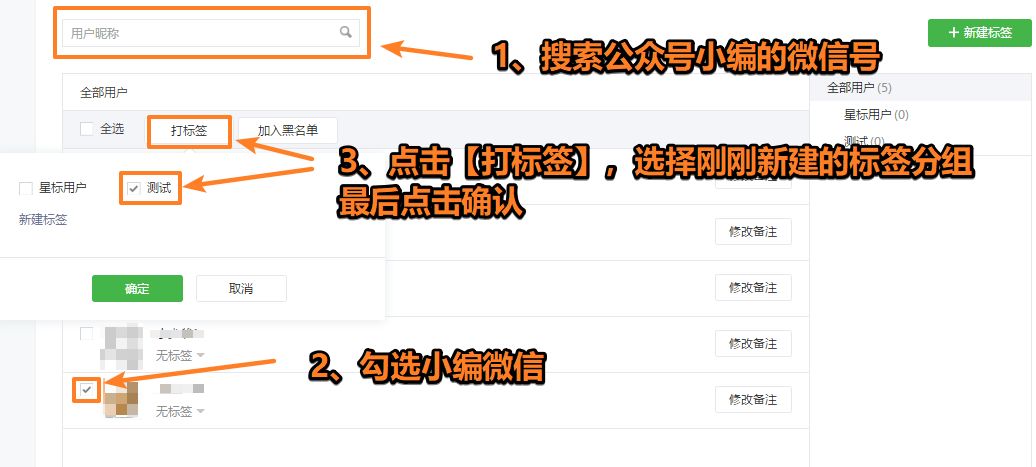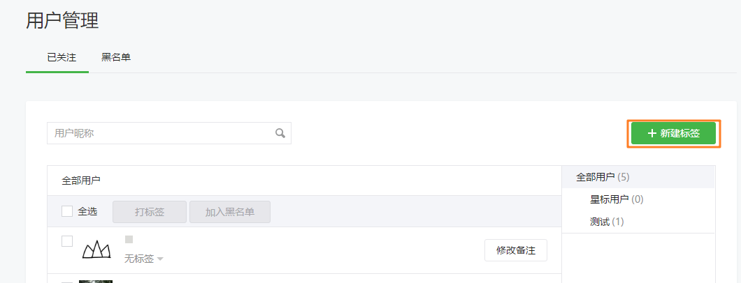 1、在微信公眾號后臺頁面左側(cè)點擊【用戶管理】,然后選擇【新建標(biāo)簽】,新建一個本次測試的標(biāo)簽(三兒設(shè)置的是‘測試’)。