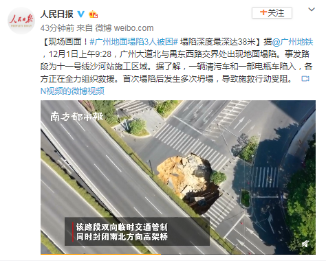 據(jù)@廣州地鐵 ,12月1日上午9:28,廣州大道北與禺東西路交界處出現(xiàn)地面塌陷。事發(fā)路段為十一號線沙河站施工區(qū)域。據(jù)了解,一輛清污車和一部電瓶車陷入,各方正在全力組織救援。首次塌陷后發(fā)生多次坍塌,導(dǎo)致施救行動受阻。