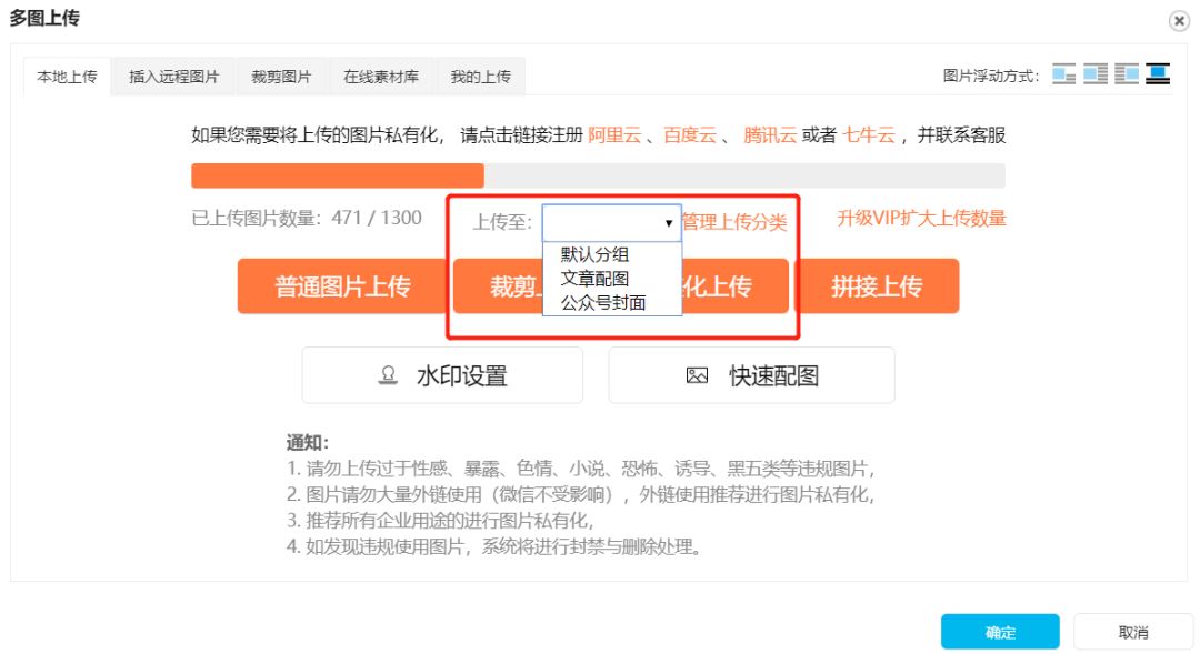 進(jìn)入到圖片上傳界面以后,我們可以為即將上傳的圖片設(shè)置分組。如果你還沒有設(shè)置圖片的分組,點(diǎn)擊【管理上傳分類】,就可以為圖片添加分組啦!