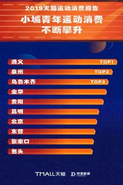 天貓發(fā)布的《2019運(yùn)動(dòng)消費(fèi)趨勢(shì)報(bào)告》顯示:二三四線地區(qū)和農(nóng)村的50后是運(yùn)動(dòng)消費(fèi)增速最高的人群,年消費(fèi)金額增長達(dá)到53.3%,這個(gè)數(shù)字遠(yuǎn)高于90后的36.5%。女性為運(yùn)動(dòng)投入的意愿也在加強(qiáng)。在天貓上,女性消費(fèi)人數(shù)已經(jīng)超越男性,年消費(fèi)金額也逐年攀升,較上一年增長了38%。此外,數(shù)據(jù)顯示,在天貓上運(yùn)動(dòng)消費(fèi)排名前五的城市分別是遵義、泉州、烏魯木齊、金華、貴陽。