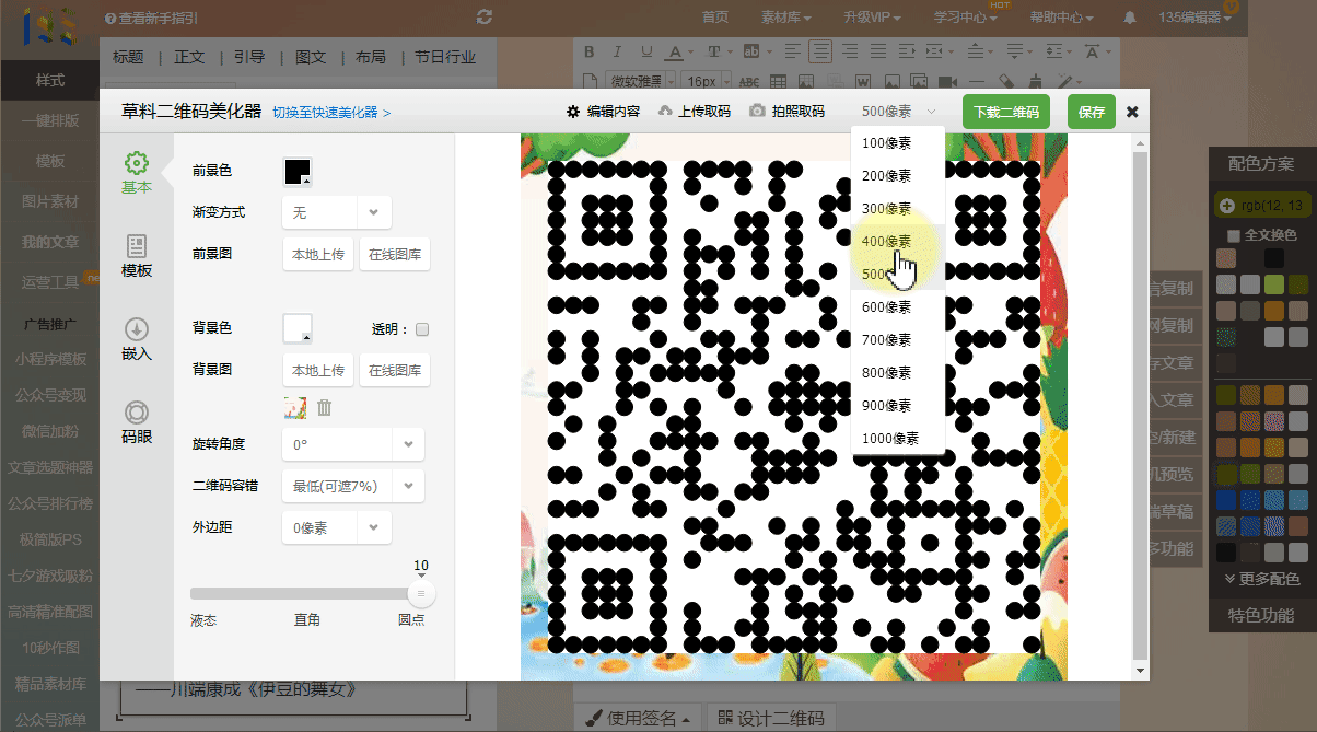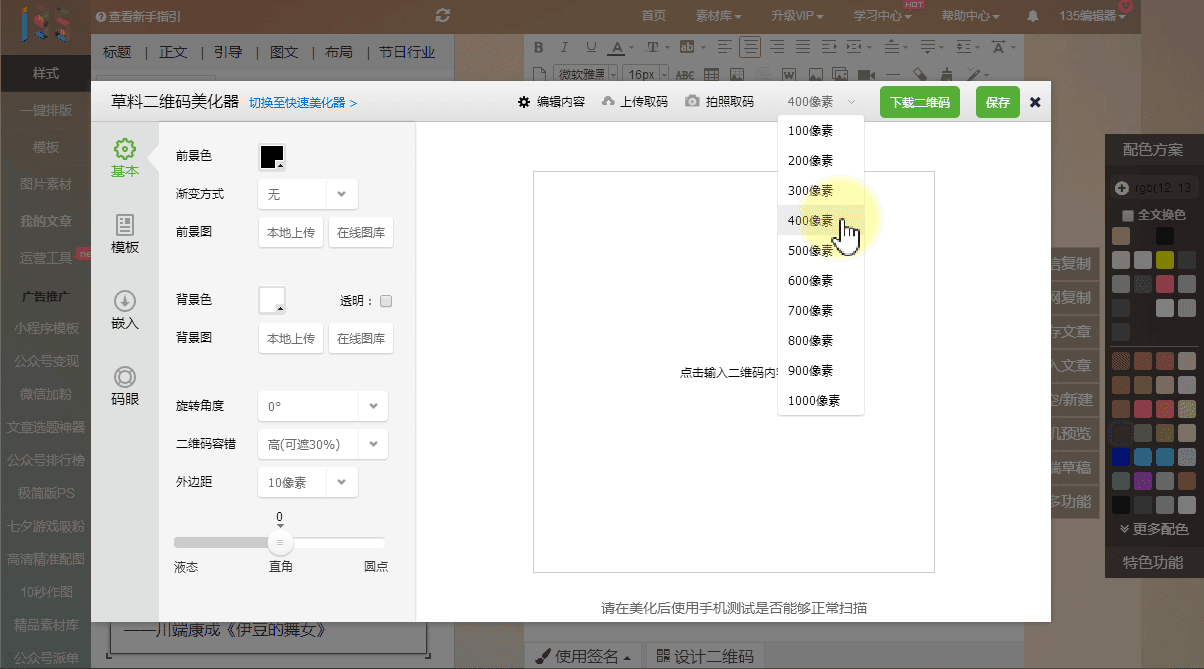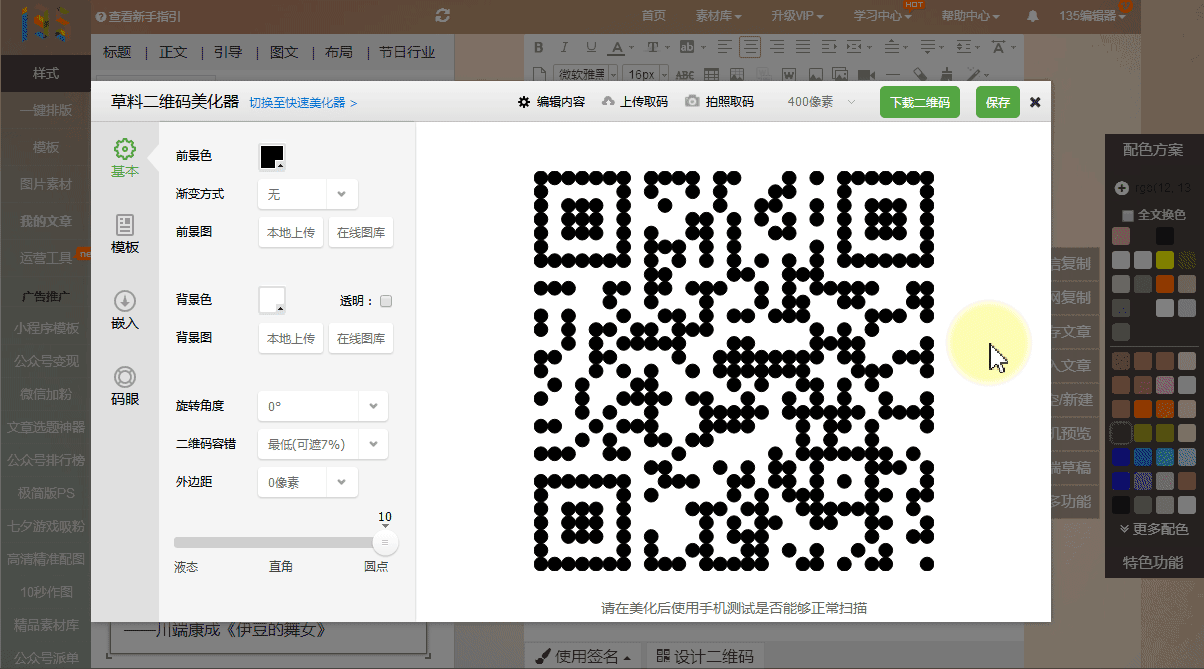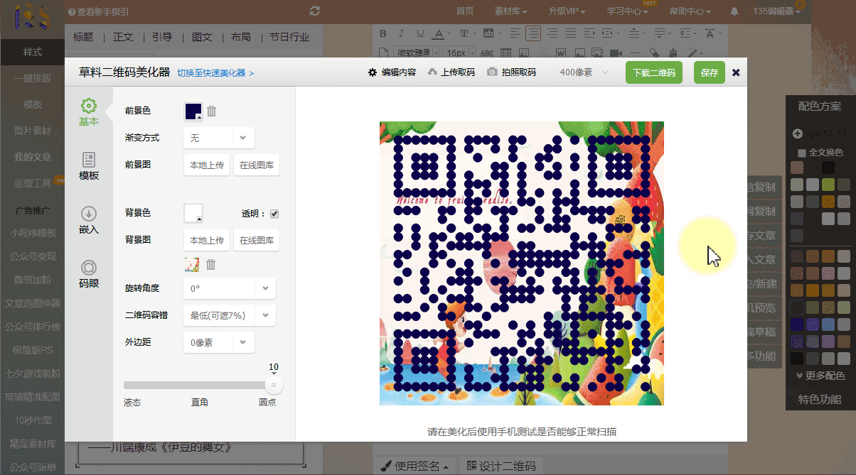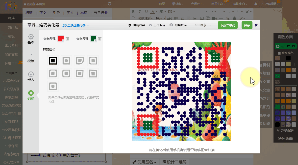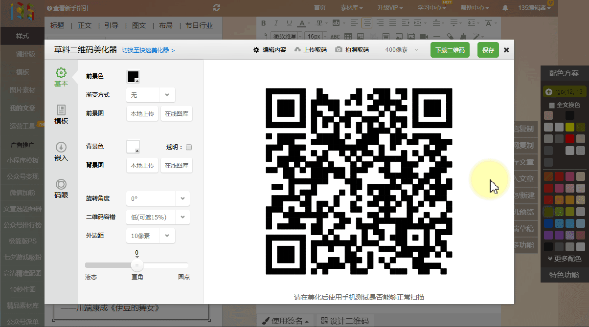 最后一步,下載我們美化好的二維碼。當(dāng)然,你也可以直接點(diǎn)擊保存,二維碼也會(huì)直接保存在135編輯器的編輯區(qū)域內(nèi)。