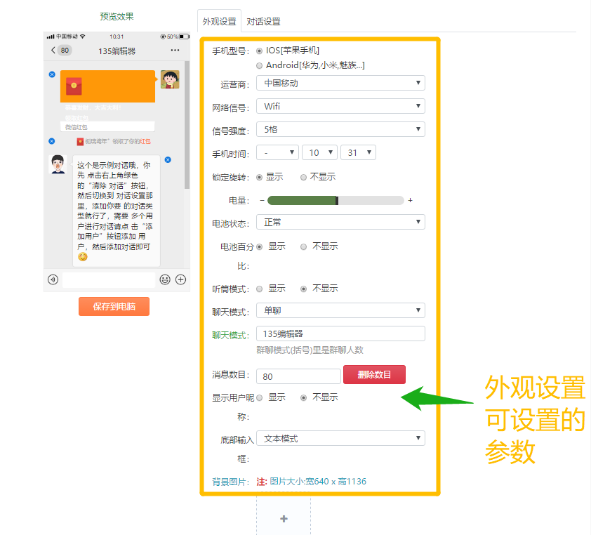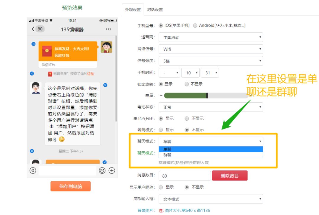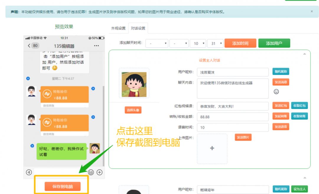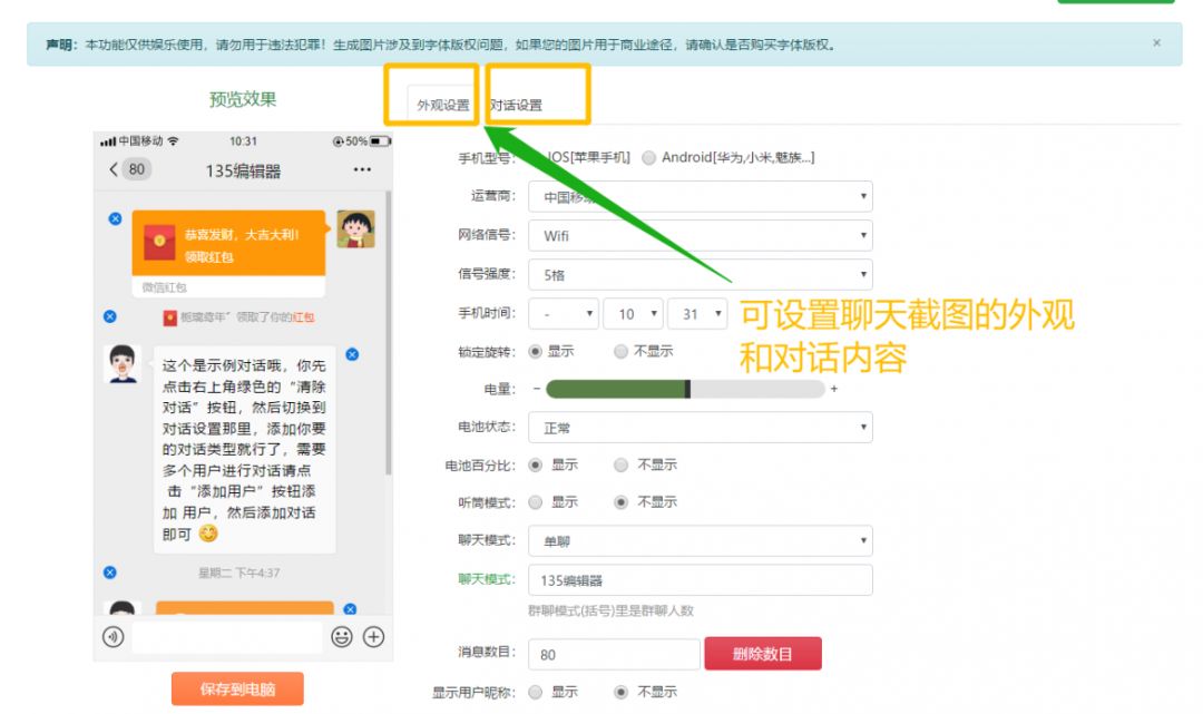 6、完成所有內(nèi)容的設(shè)置以后,點擊保存到電腦,即可自動生成聊天截圖,然后再回到編輯器上傳圖片即可。