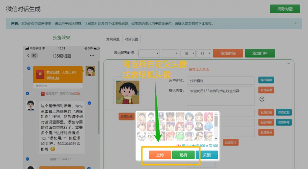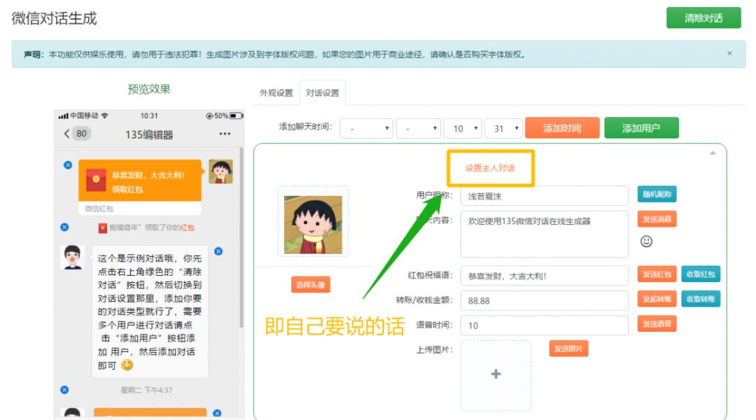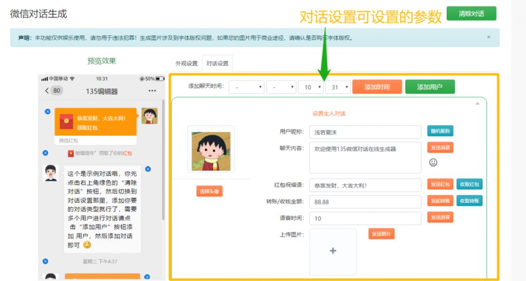 4、對話設(shè)置可以對截圖內(nèi)對話進行編輯,可設(shè)置的參數(shù)包括頭像、添加聊天時間、添加聊天用戶、設(shè)置用戶昵稱、聊天內(nèi)容、紅包祝福語、轉(zhuǎn)賬/收錢金額、語音時間、圖片,大家根據(jù)自己的需求編輯內(nèi)容即可。