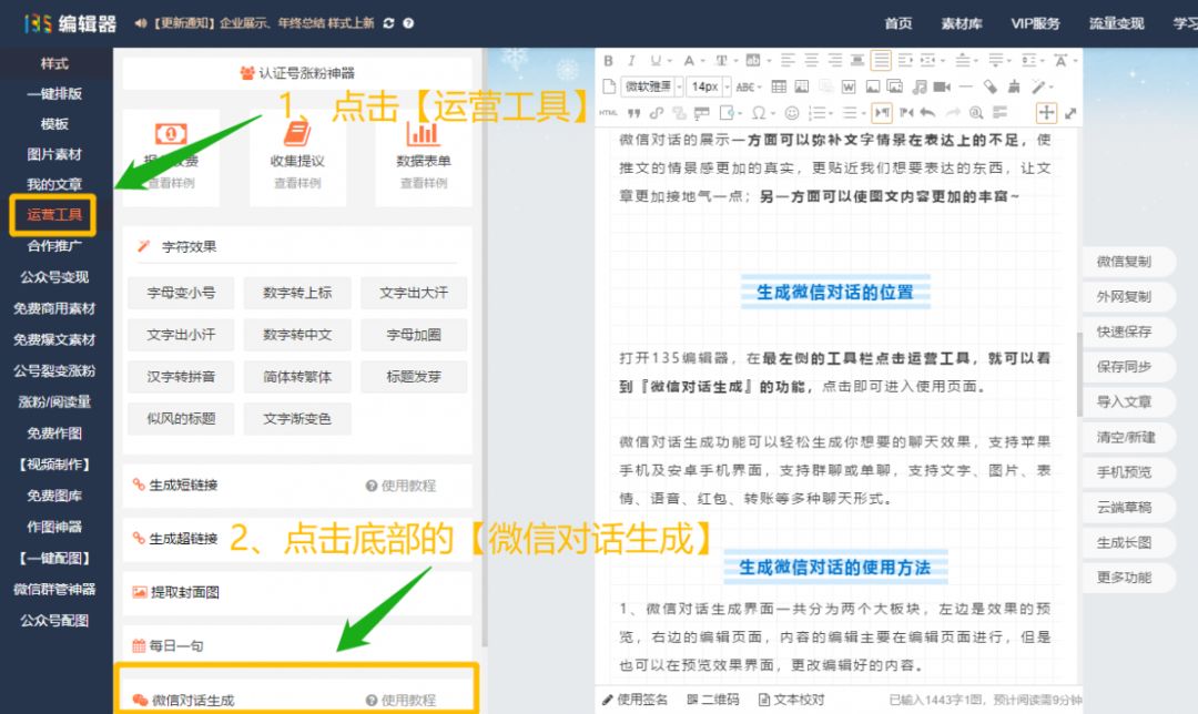打開135編輯器,在最左側(cè)的工具欄點擊運營工具,就可以看到『微信對話生成』的功能,點擊即可進入使用頁面。