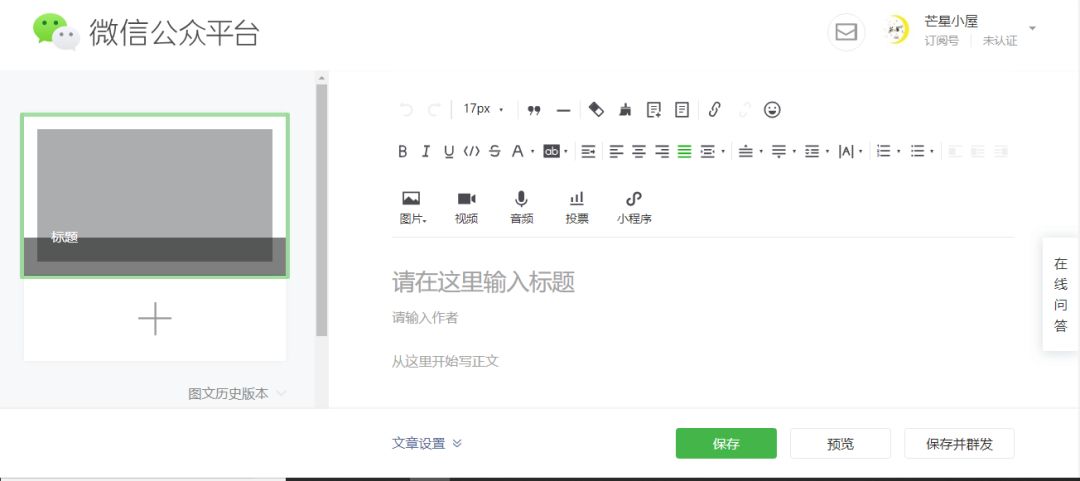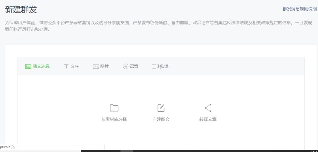 如果你要發(fā)送內(nèi)容,打開首頁(yè)的新建群發(fā)就可以編輯你要發(fā)送的內(nèi)容了,可以選擇發(fā)送圖文消息,文字,圖片,語(yǔ)音或者視頻。
