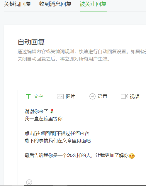 點(diǎn)開自動(dòng)回復(fù)功能填寫被關(guān)注回復(fù)的內(nèi)容,當(dāng)你的公眾號(hào)被關(guān)注的時(shí)候就會(huì)回復(fù)你所填的內(nèi)容。
