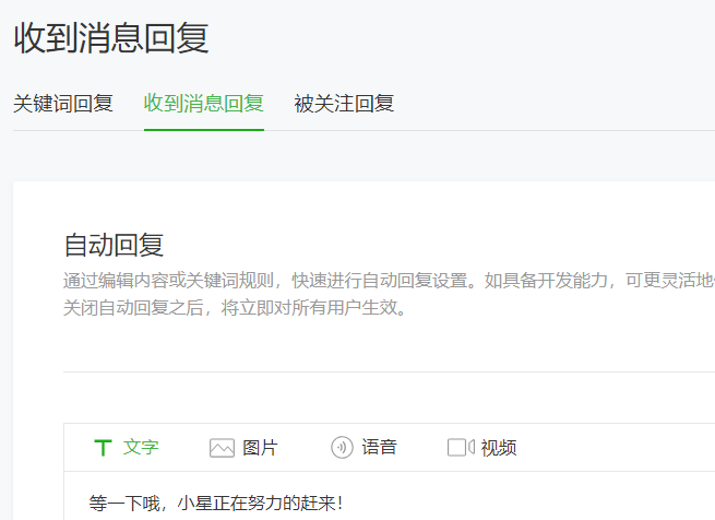 收到消息回復(fù)是別人在你的公眾號(hào)對(duì)話框發(fā)送對(duì)話的時(shí)候它可以自動(dòng)發(fā)送你之前編輯好的內(nèi)容,當(dāng)你自己有空的時(shí)候就可以去回復(fù)別人了。