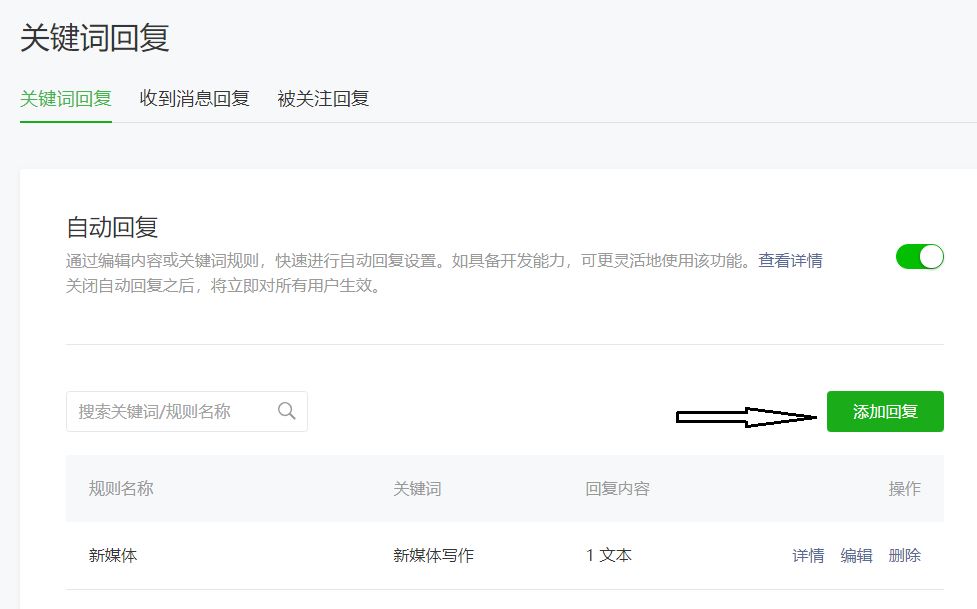 關(guān)鍵字回復(fù)是別人在對(duì)話框回復(fù)特定的字的時(shí)候就會(huì)推送給他相應(yīng)的內(nèi)容,你可以在添加回復(fù)里添加回復(fù)的關(guān)鍵字和發(fā)送的內(nèi)容,這樣別人在回復(fù)關(guān)鍵字的時(shí)候就可以收到你編輯的內(nèi)容了。