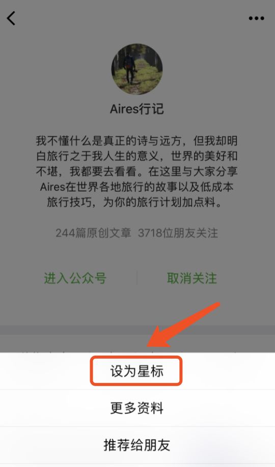 首先,打開公眾號首頁,然后強(qiáng)烈建議你將公眾號「設(shè)為星標(biāo)」,設(shè)置星標(biāo)后在「訂閱號消息」提示中會優(yōu)先顯示星標(biāo)號文章,這樣你不容易錯過更新。