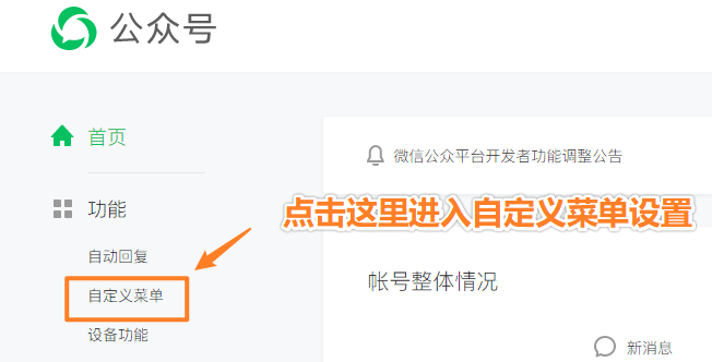 接下來我們說一說在微信后臺如何設置吧,登錄微信公眾平臺后,在左側(cè)功能區(qū)選擇『自定義菜單』,進入自定義菜單編輯界面。