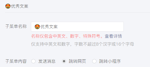 這里需要注意的是:我們插入emoji表情后,后臺提示:“名稱僅包含中英文、數(shù)字、特殊符號”的紅色字提醒我們不能使用emoji表情,這要如何解決呢?