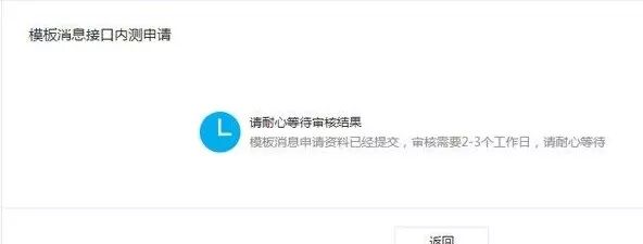 提交后,頁面會出現(xiàn)該提示:請耐心等待審核結(jié)果,模版消息申請資料已經(jīng)提交,審核需要2-3個工作日。所以接下來就是等審核了,審核通過后,就能使用了。